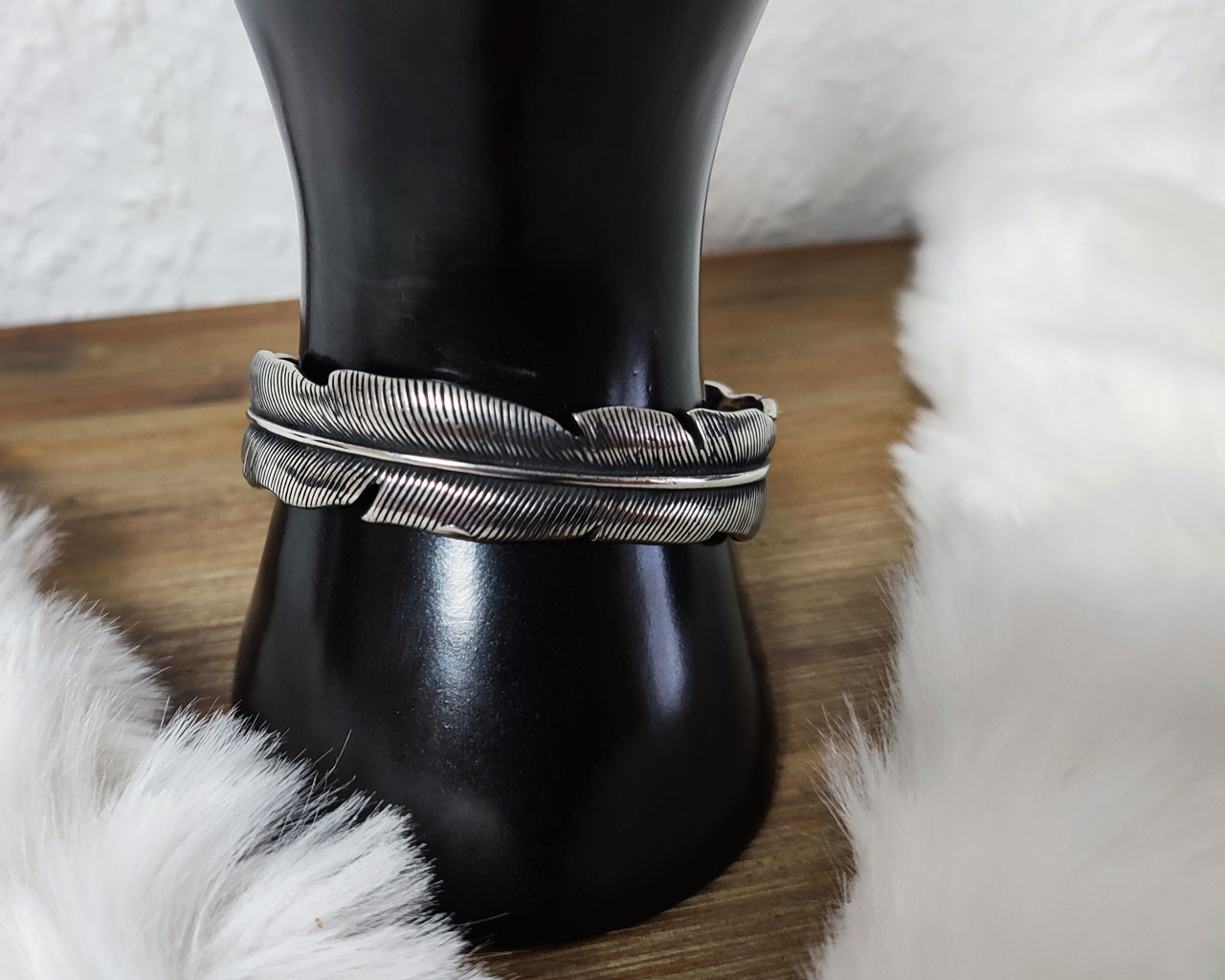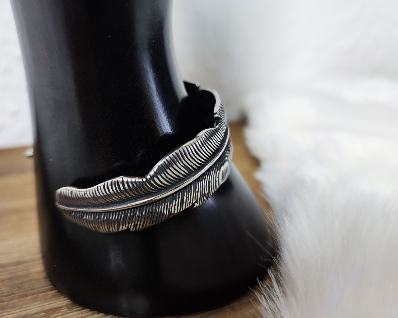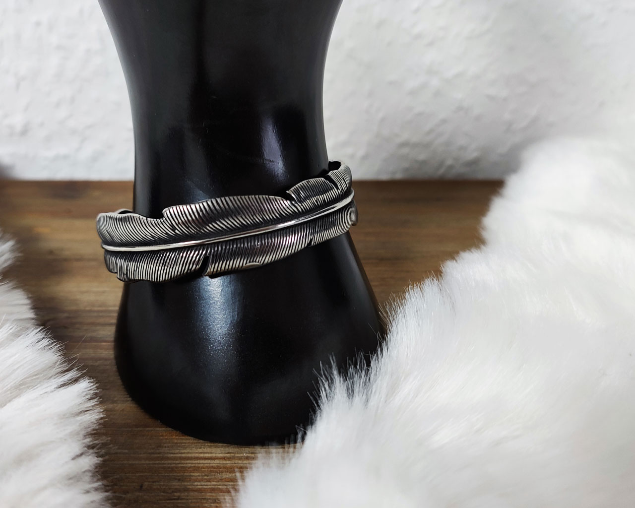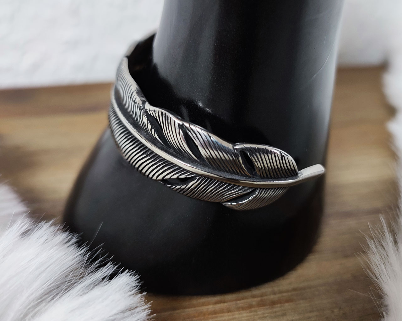 das eine Feder imitiert. Die Feder ist kunstvoll gearbeitet und verleiht dem Armreif eine elegante