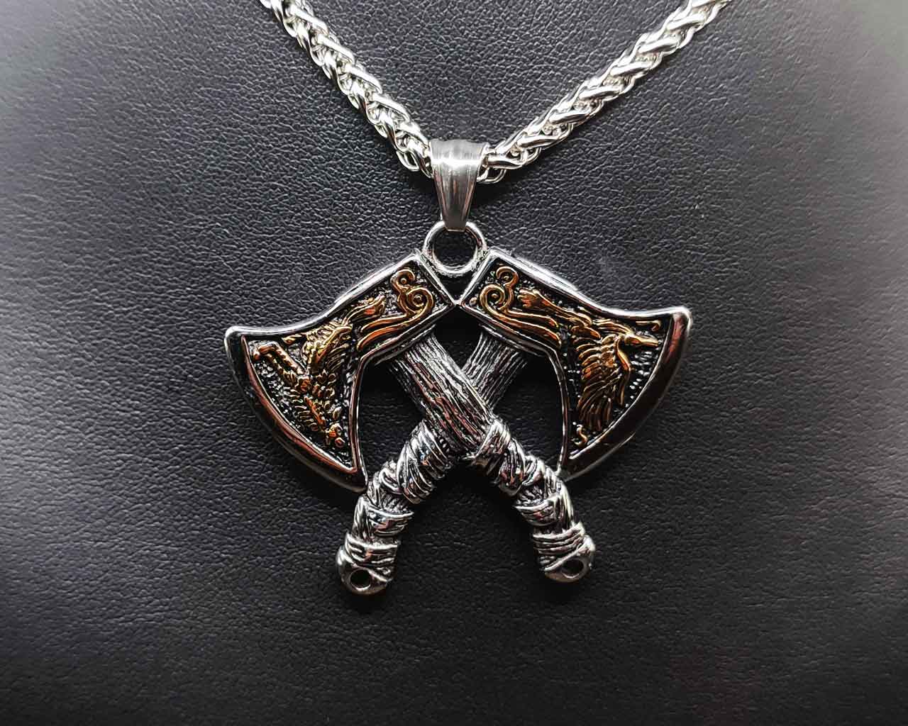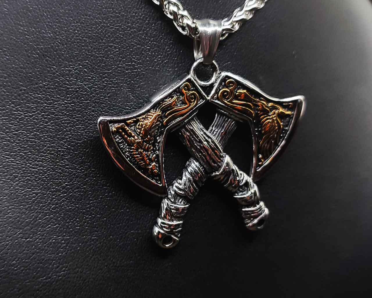 Die feinen Details und die hochwertige Verarbeitung der beiden Äxte, kombiniert mit den eleganten Gold- und Silberfarbtönen, heben dieses Schmuckstück von herkömmlichen Designs ab. Die goldene Färbung symbolisiert nicht nur Reichtum und Macht, sondern auch die göttliche Weisheit und Erleuchtung, die Odin auf seinen Reisen durch die Neun Welten erlangte. Die silbernen Elemente spiegeln die Klarheit und Reinheit des nordischen Geistes wider und schaffen eine perfekte Harmonie mit dem Gold, die die Dualität von Sonne und Mond, Tag und Nacht, sowie die ewige Balance des Universums darstellt.
