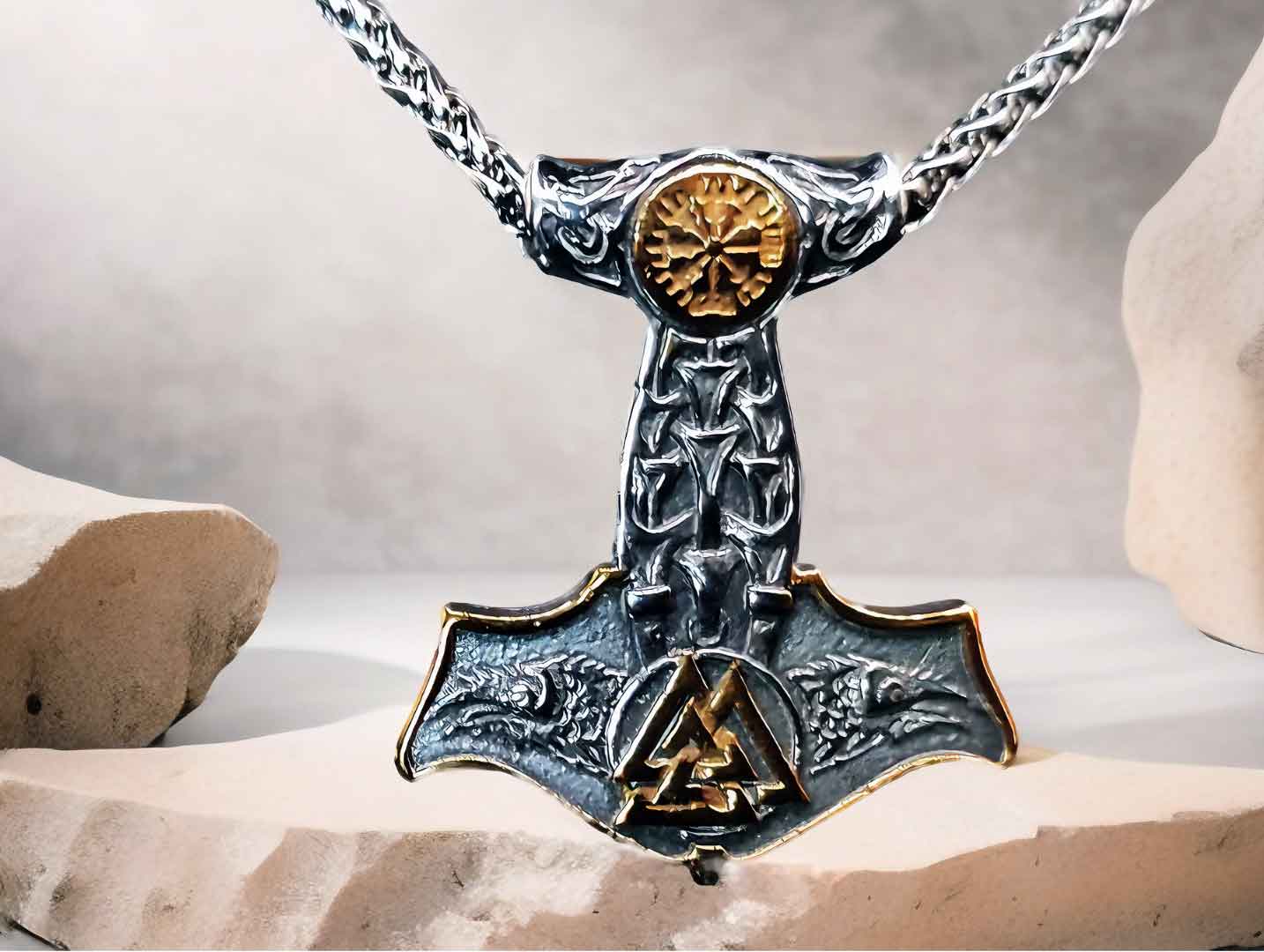 Stellen Sie sich ein Stück Schmuck vor, das nicht nur durch sein Design besticht, sondern auch die Macht und Geschichte einer ganzen Kultur in sich trägt. Unser Thors Hammer, gefertigt aus hochwertigem Edelstahl und veredelt mit silbernen und goldenen Akzenten, ist genau das – ein wahrhaft königliches Schmuckstück, das die nordische Mythologie zum Leben erweckt.