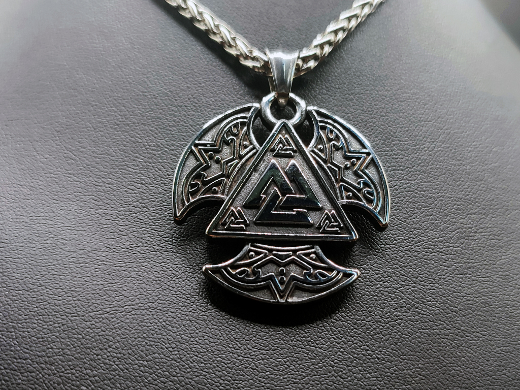 Dieses markante Amulett verbindet zwei kraftvolle Elemente der nordischen Symbolik: das Valknut – ein aus drei verschlungenen Dreiecken bestehendes Zeichen – und die Form einer Doppelaxt. In der altnordischen Mythologie steht das Valknut in enger Verbindung mit dem Göttervater Odin und wird als Symbol für Tapferkeit, Kampfgeist und die Reise ins Jenseits interpretiert.