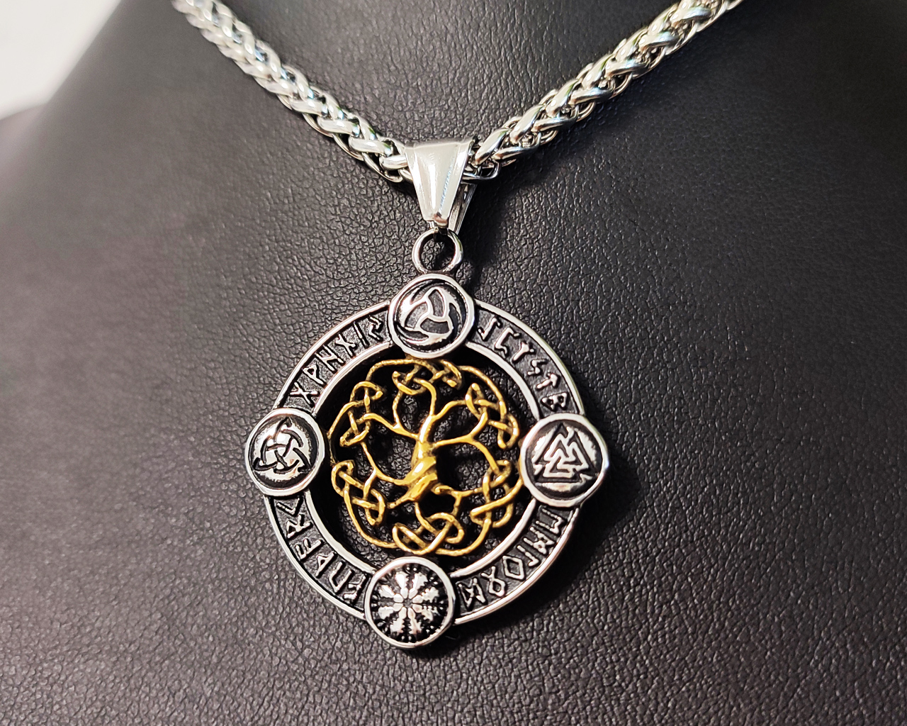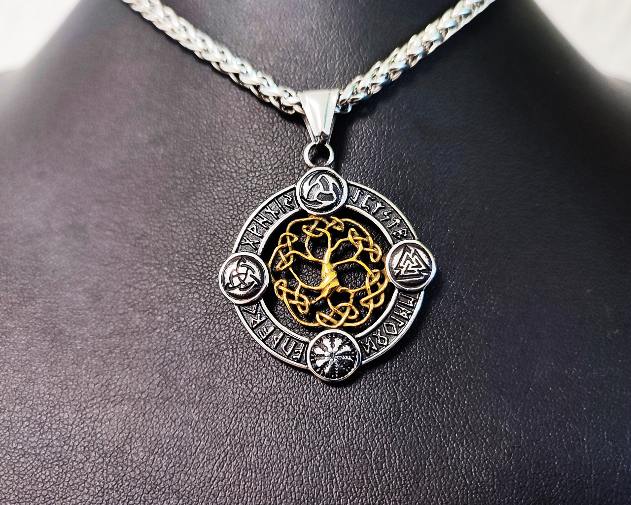 Der äußere Ring zeigt fein gestaltete nordische Symbole und Runen, die dem Amulett eine mystische Aura verleihen. Dank seiner zweiseitigen Bauweise kannst du selbst entscheiden, welche Seite heute deine Kräfte leiten soll – ein wenig wie ein magischer Münzwurf, nur viel stylischer.