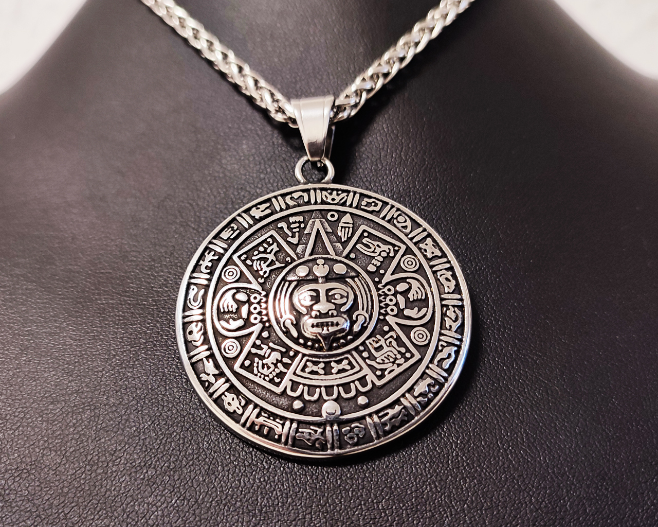 Boom! The legendary Aztec sun god Tonatiuh now grins at you from the mirror every day. This solid stainless steel pendant (57 x 42 mm, 26.9 g of pure power) is practically the original Mayan calendar medallion—only without the 2012 apocalypse (we survived that, thanks for asking).