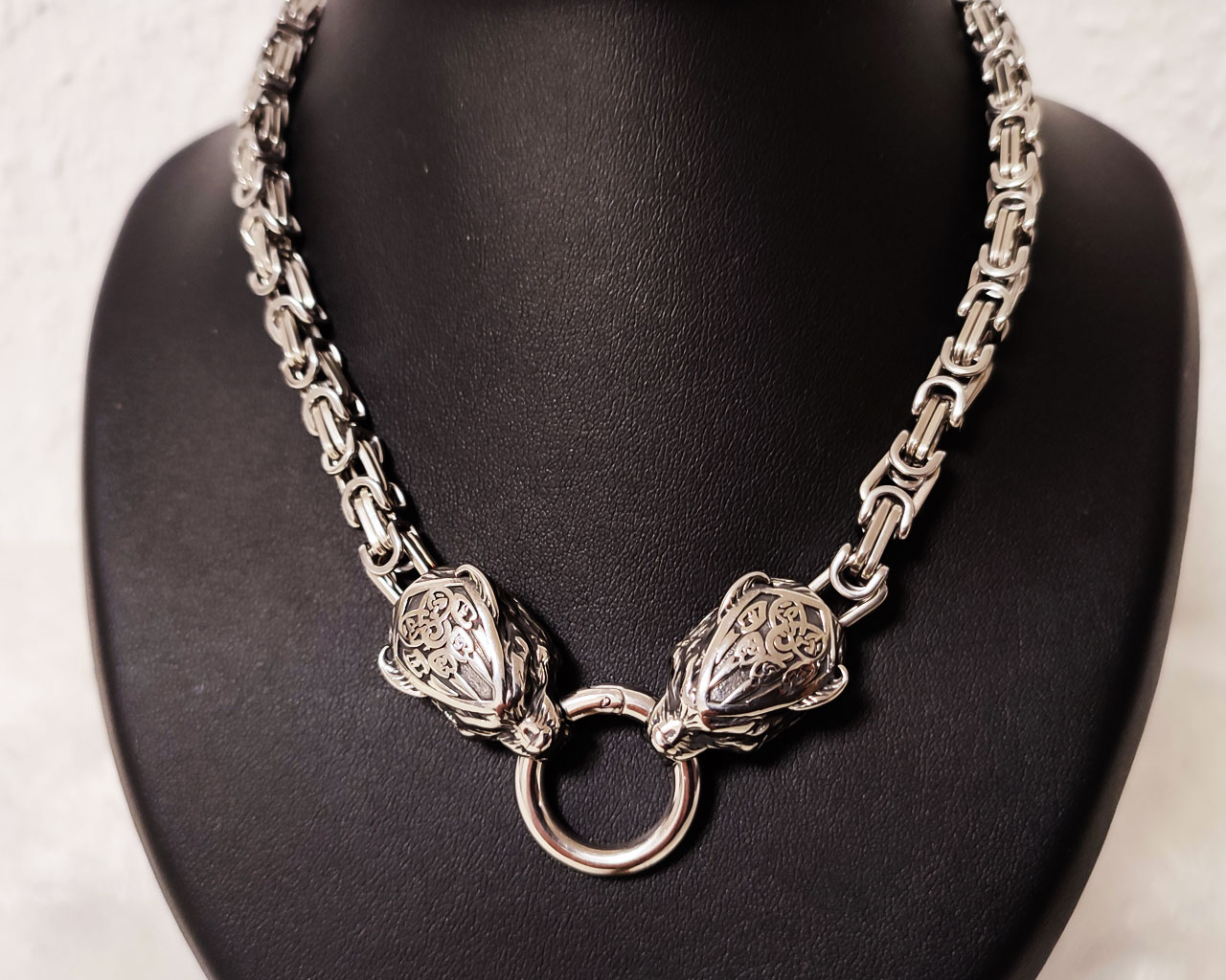 Viking stainless steel necklace with decorated wolf heads