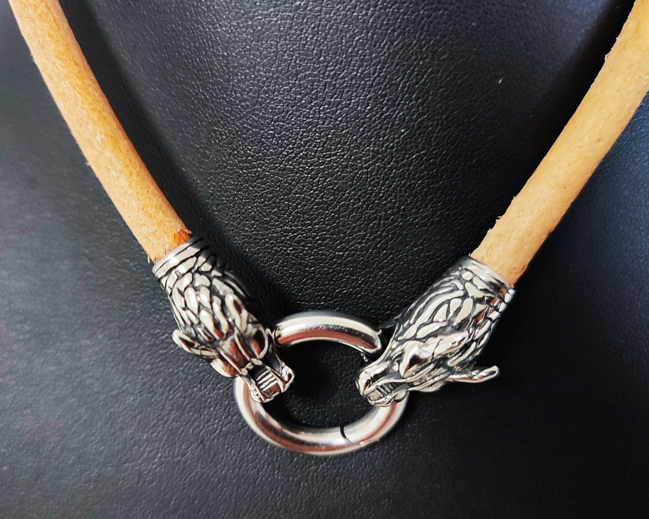 This natural-colored solid leather necklace with stainless-steel wolf heads brings together raw strength and grounded elegance.